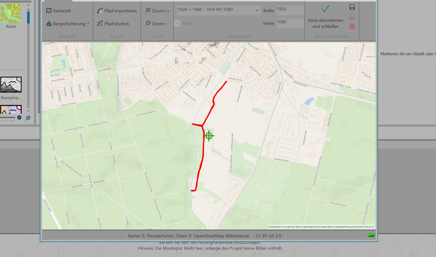 Es hat auch soweit geklappt. Nur wenn ich dann auf Karte Übernehmen klicke, ist der Pfad doch deutlich abgewandelt. In Bild 2 (unten) sieht man, wie der gegangene Weg tatsächlich war und in Bild 1 das, was dann die Umsetzung in einen Bewegungspfad in Stages daraus geworden ist. Die Abweichung ist doch gut sichtbar, sprich die Auflösung einfach zu grob. Mache ich da was falsch oder war die Strecke einfach zu kurz? Genug GPX-Daten sind eigenlich vorhanden. Man kann sie sich ja in einem normalen Schreibprogramm anschauen.