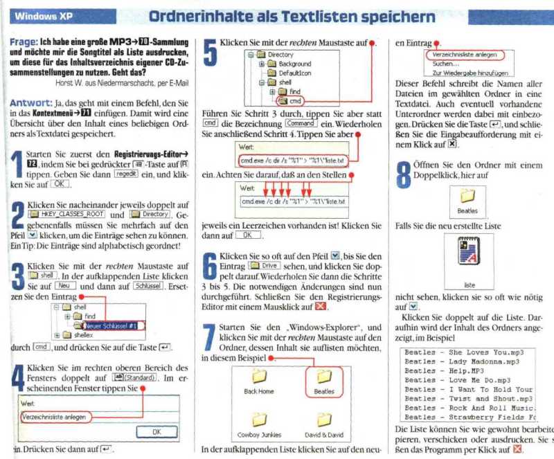 habe da in Computerbild einen schöne Tipp gefunden, mit dem man die Inhalte eines Verzeichnisse sowie dessen Unterverzeichnissen als TXT-Datei ausdrcken bzw. er-stellen kann.