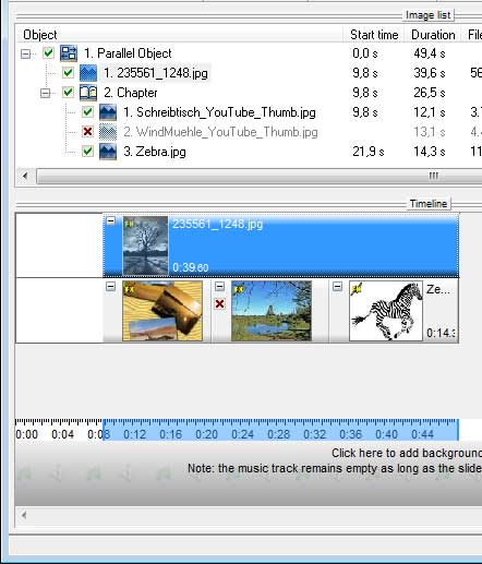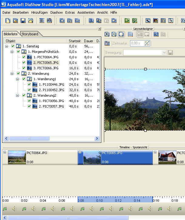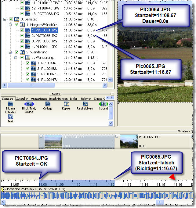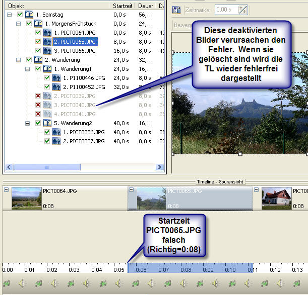 ich verwende Diashow Studio Version 5.06.06 zur Erstellung meiner Diashows. Bei dem Versuch die HGM auf ein bestimmtes Bild auszurichten habe ich festgestellt, dass die Timelineanzeige fehlerhaft ist. Der Fehler ist aus dem beigefügten Anhang ersichtlich. Dort wird das Bild PIC0065.JPG in der Timeline zu einem falschen Startzeitpunkt angezeigt (11:12.xx statt 11:16.67) obwohl der Startzeitpunkt des vorherigen Bildes (11:08.67) noch richtig ist und dieses Bild eine Dauer=8.0 sec hat.