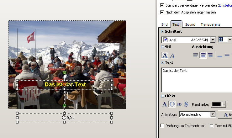 ich würde noch eine Nachbesserung von Aquasoft erwarten, daß bei anklicken in den Eigenschaften auf Text, sich die Bewegungsmarken zeigen. Momentan bleit nur die Möglichkeit, daß Du weisst wo Dein Text ausserhalb ungefähr steht und durch klicksuchen mit der Maus die Bewegungsmarke auftaucht.