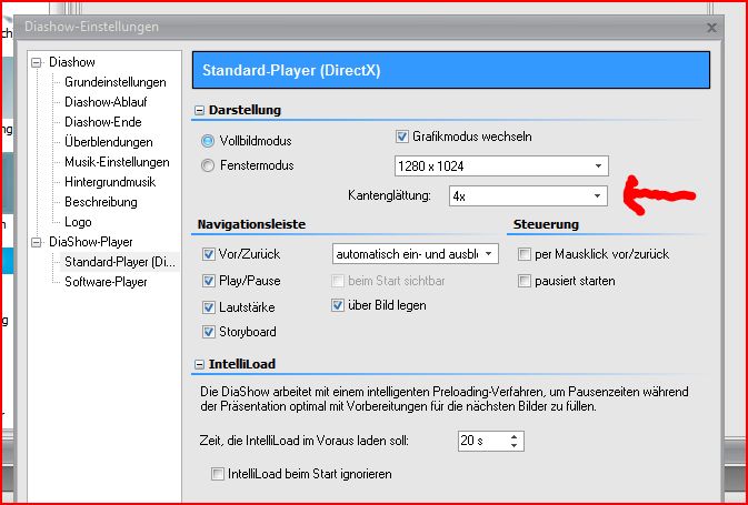 Ich habe die Kantenglättung meines DirectX-Players (Version: 7.1.03) geändert. Hierbei ist mir aufgefallen, dass die Eingabemöglichkeiten von der Beschreibung der Hilfeseiten abweicht.
