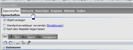 das ist ganz einfach. Luckyharry hat weitere Steuerelemente eingefügt und diese an der selben Stelle das Ansichts-Layouts eingebaut wie die Eigenschaften (schau mal in der DioaSow unter 'Ansicht - Steuerelemente'). Dabei entstehen automatisch diese Reiter, mit denen man auf diese Bereiche zugreifen kann. Mit der Ultimate-Version der Diashow kann man sich beliebige eigene Ansichten erzeugen und abspeichern.
