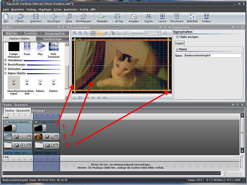 Ich habe ein leeres Bild-png 16:9 erstellt und auch so abgespeichert. In einem neuen Kapitel ziehe ich als 1. einen schwarzen Hintergrund (1) ins Kapitel, als nächstes das leere PNG-Bild (3) und aus der Toolbox (beispielsweise) den Bambusrahmen auf dieses Bild (3). Als letztes das gewünschte Bild (2) genau in dieser Reihenfolge. Das Bild (2) muss ich noch anpassen (darf nur bis Mitte Babusrahmen = rote Linie gehen).