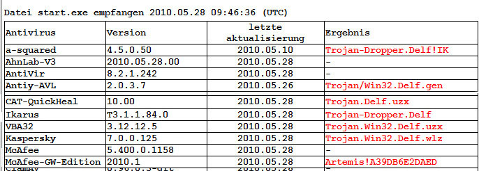 wenn ich den Tests von Virenscannern z.B. in der c't vertrauen darf, so wird in diesen Tests immer wieder darauf hingewiesen, dass die Suchmaschinen diverser Virenscanner identisch bzw. den gleichen Kern haben. Sie werden jedoch von unterschiedlichen Firmen mit auch unterschiedlichen Oberflächen vertrieben. Eine häufig verwendete Suchmaschine stammt z.B. von Kaspersky. So ist es erklärlich, dass angeblich unterschiedliche Programme durchaus identische Funde liefern. Was jedoch an Deiner Zuschrift mit dem Screenshot auffällt ist, dass angeblich durchaus unterschiedliche Funde gemeldet werden, die mal Virus, mal Trojaner sein sollen. Und was mich ebenfalls verwundert, ist folgendes: Ich habe von der 7.5.03 und der 7.1.03 die start.exe zum Test hochgeladen. Bei beiden meldete bei mir beim Onlione-Test McAffee einen Fund. Bei Dir nicht. Dafür hatte ich nur einen bzw. zwei Funde. Renomierte und als sehr gut bewertete Scanner (z.B. GData) fanden jedoch keinen. Ich halte diese Meldungen zumindest der von mir hochgeladenen start.exe für Fehlmeldungen alles getrost der Regel "eine Schwalbe macht noch keinen Sommer" und "wenige Treffer machen noch keinen Virus". Trotz allem sollte AS der Sache einmal nachgehen.