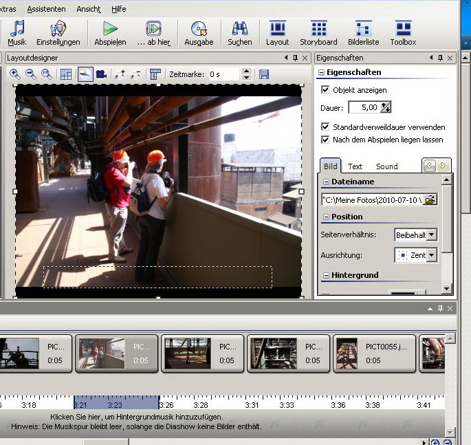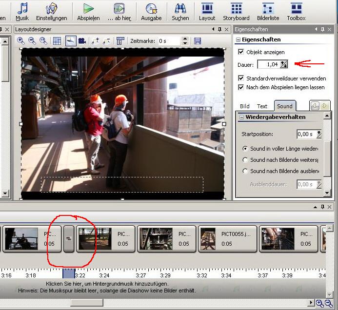 habe zu der Diashow einen Hintergrundsound angelegt. Soweit ok. Nun möchte ich auf das eine oder andere Bild ein Geräusch hinterlegen. Klappt auch, aber das Geräusch dauert nur 1,5 Sek. und das Bild wird jetzt auch nur in dieser Länge gezeigt. Es soll aber die 5 Sek. Standardzeit halten. Kann man das machen und wenn ja, wie.