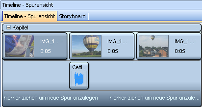 Ich habe es schon fast vermutet, dass Du den Sound in der gleichen Spur hast. Probier es mal mit dem Kapitel aus, das ist nicht schwer (und eigentlich auch sehr hilfreich). Ziehe ein Kapitel in die Timeline. In dieses Kapitel ziehe ein paar Bilder. Dann ziehe ein Soundobjekt in (das geöffnete) Kapitel derart, dass Du es unter den Bildern einfügst (es erscheint eine rote Linie, wenn Du das Soundobjekt im Kapitel nach unten ziehst). Es sollte ähnlich wie auf meinem Screenshot aussehen. Hier kannst Du das Geräusch dann beliebig platzieren.
