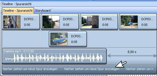 die "2. Timeline" (= 2.Spur bzw. beliebige weitere Spuren) erzeugst Du, indem Du ein Objekt in den Bereich ziehst, der mit "hierher ziehen um neue Spur anzulegen" betitelt ist. Ich füge mal einen Screenshot zur Verdeutlichung bei und hoffe, dass Du erkennen kannst, was gemeint ist. Wenn Du dann das Soundobjekt in eine eigene Spur ziehst und -wie schon von Günter beschrieben- in den Eigenschaften des Soundobjektes den Haken bei "Sound nach eingestellter Dauer ausblenden" setzt, dürfte das so funktionieren, wie Du Dir das vorstellst.